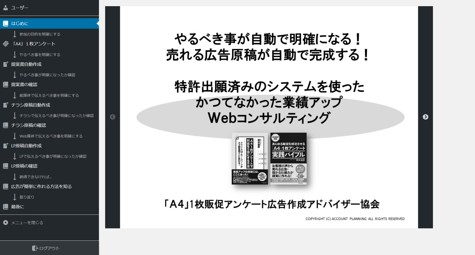 当協会の「A4」1枚アンケートやマンダラシートを有効に活用しながら、見込客に御社の強みがうまく価値として伝わるように、LP・入口商品・ステップメール・セールス型セミナー・個別相談技術・各種広告媒体などのマーケティングツールを選定し、テストしながら『外からは見えない独自の売れるしくみ』が回るまで丁寧に伴走します。チラシ、LPやステップメールなどツール単体でもご相談可能です。