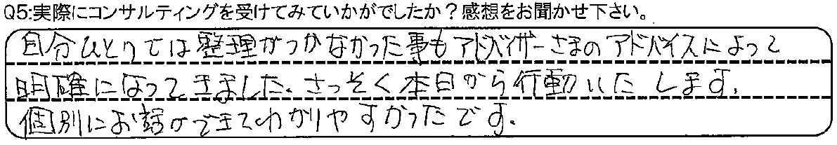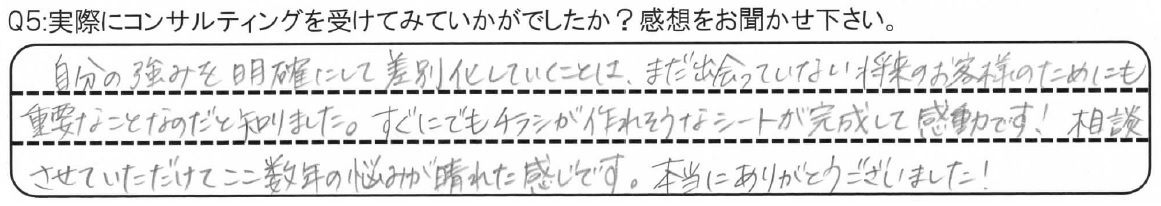 オンリー1の事業企画、商品企画が得意で、新たな顧客層と新事業の提案をその場でしております。「目の前が明るくなった」「どうしていいかわからなかったが、やることがわかった」「眼から鱗です」などの言葉を頂戴しています。