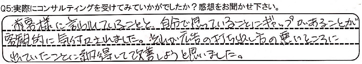 2013年アドバイザーの資格を取得。10年にわたってお客様の声アンケートを分析し販促物などを作成。岡本先生の著書「あらゆる販促を成功させる「A4」1枚アンケート実践バイブル』」にも事例が掲載。毎年事例発表に登壇しています。お客様の声を反映した広告作成で、反響率の高い訴求を実現します。